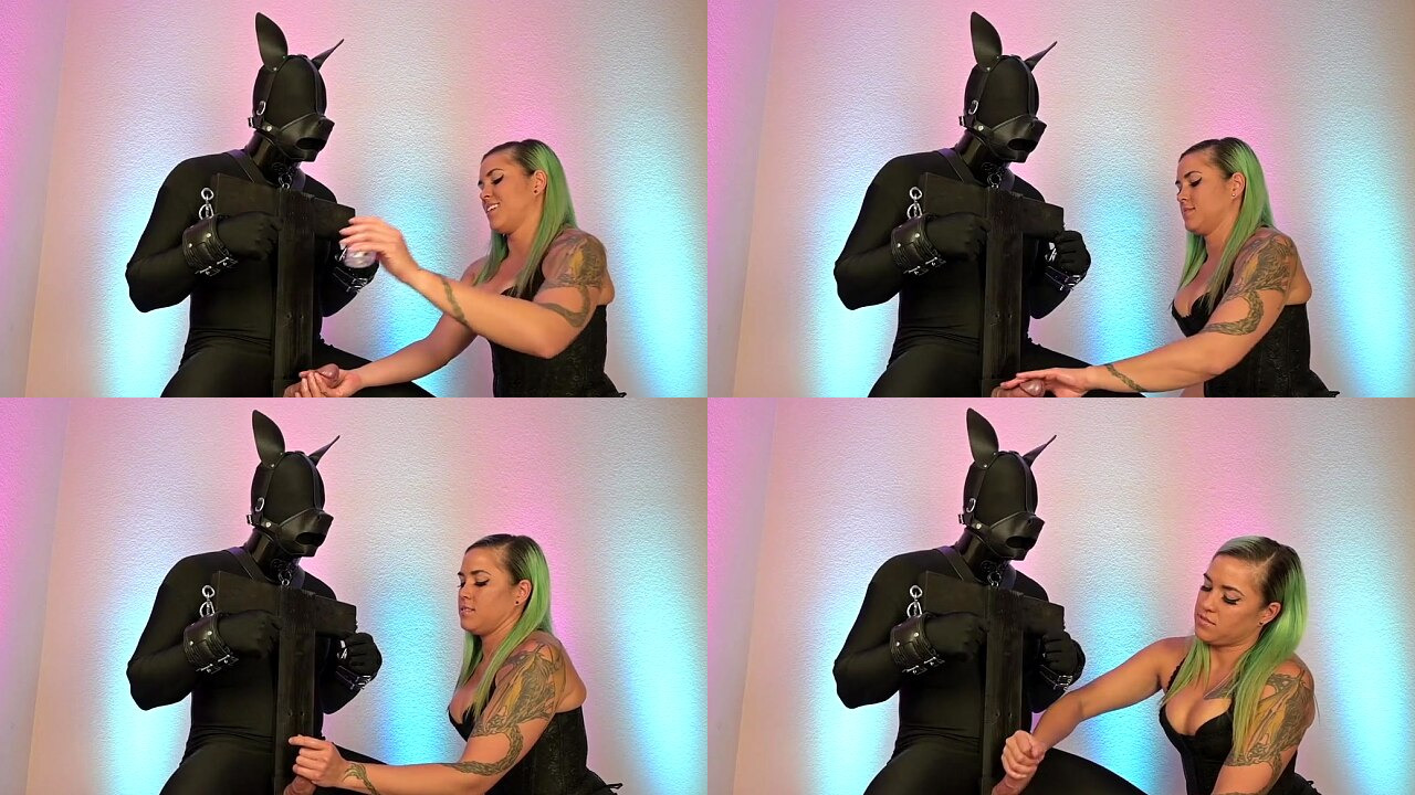 Femdom mistress plays with puppy in BDSM edging and denial handjob