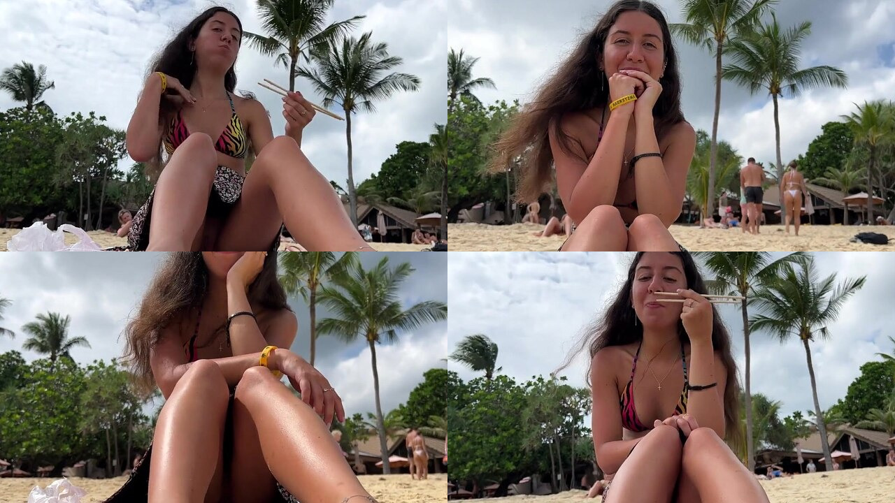 Girl eating sushi without panties among people on a public beach